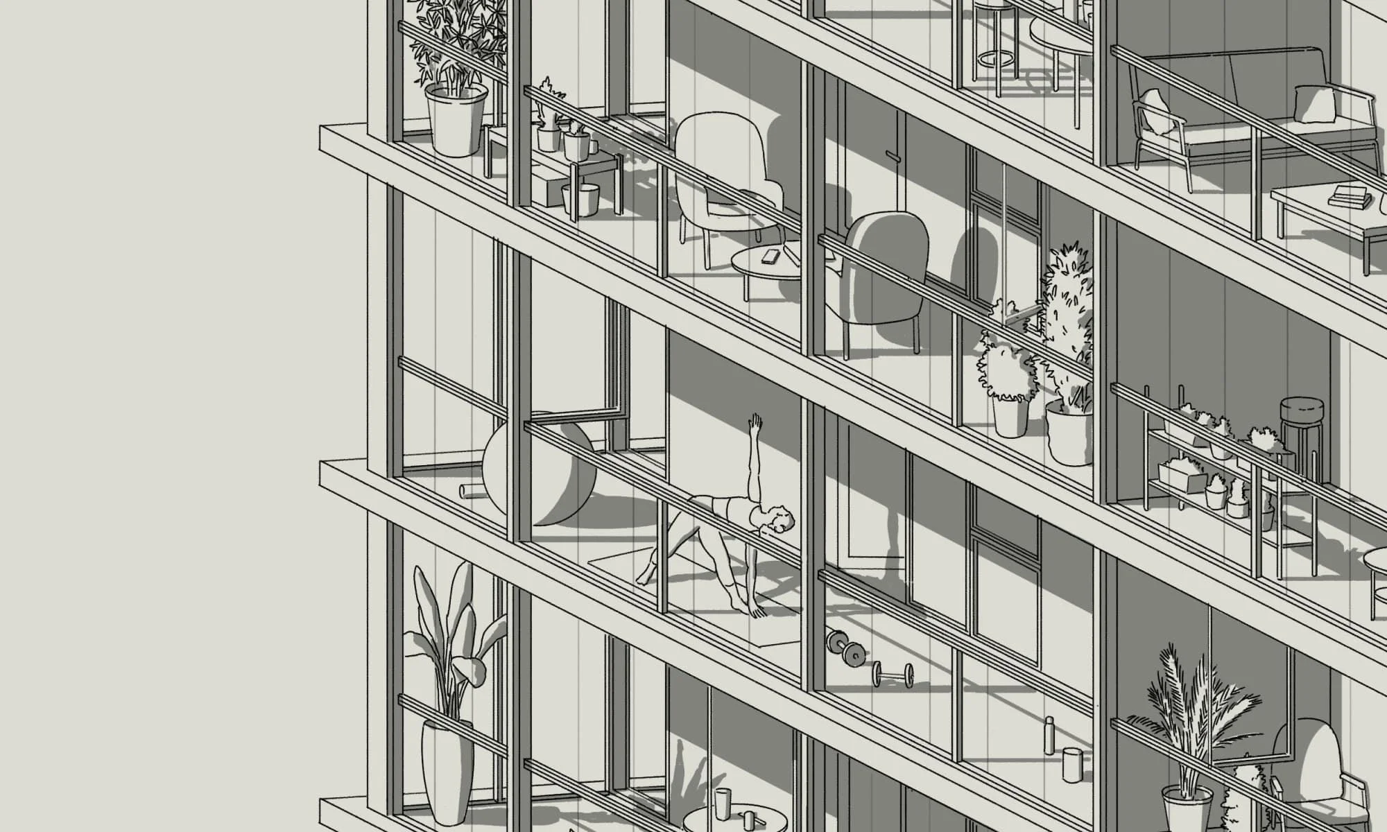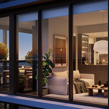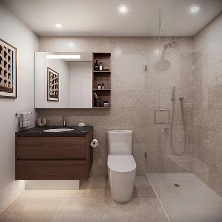 Inspirándose en las montañas, bosques y ríos circundantes, Balanced evoca el paisaje natural de Burnaby en una cálida paleta de tonos de roble gris, Dekton inspirado en cuarcita, baldosas mate en tonos arena y suelos tonales..