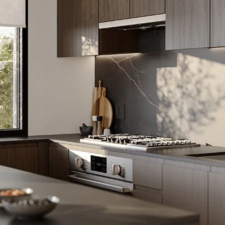 Capturando la tranquilidad del anochecer, nuestra paleta más oscura Reflect combina elegantes gabinetes de nogal, Dekton veteado similar al mármol, baldosas de cerámica y pisos tonales.